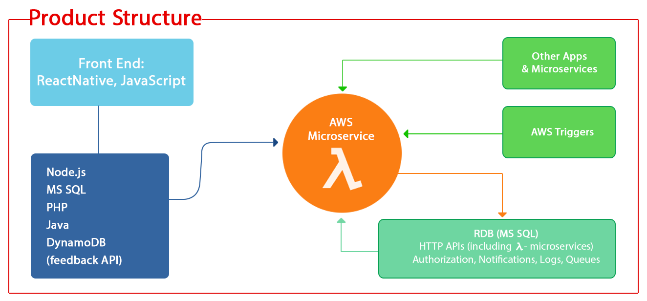 ⇒ Back End: Node.js, MS SQL, PHP, Java, DynamoDB (feedback API)
